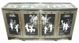 Truly beautiful black lacquered slant front oriental cabinet, with hand carved mother of pearl sea shell applique motif, beautifully finished inside, comes with removable center shelves.